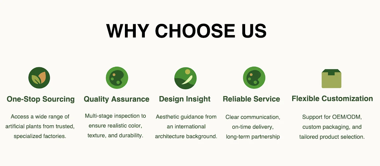 Ana ürünler:Yapay bitkiler, yapay ağaçlar, yapay bitki duvarı, yapay çiçekler, çit